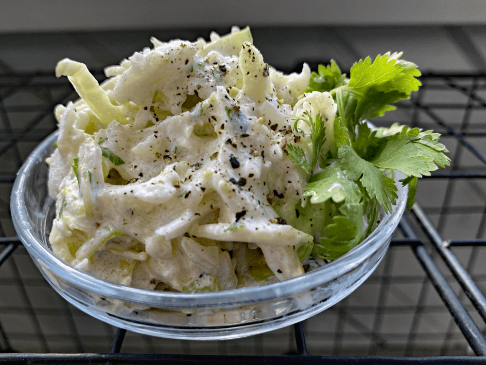 I normally am not a big fan of coleslaw, but I love this one. Several years back I worked at a restaurant and helped them prepare this. The place was known for its spicy ribs, and this delicate slaw was a perfect accompaniment to them. If you aren't a fan of cilantro, you can always leave it out, or replace it with an herb of choice. I personally love cilantro and welcome this dish alongside any spicy barbecue!