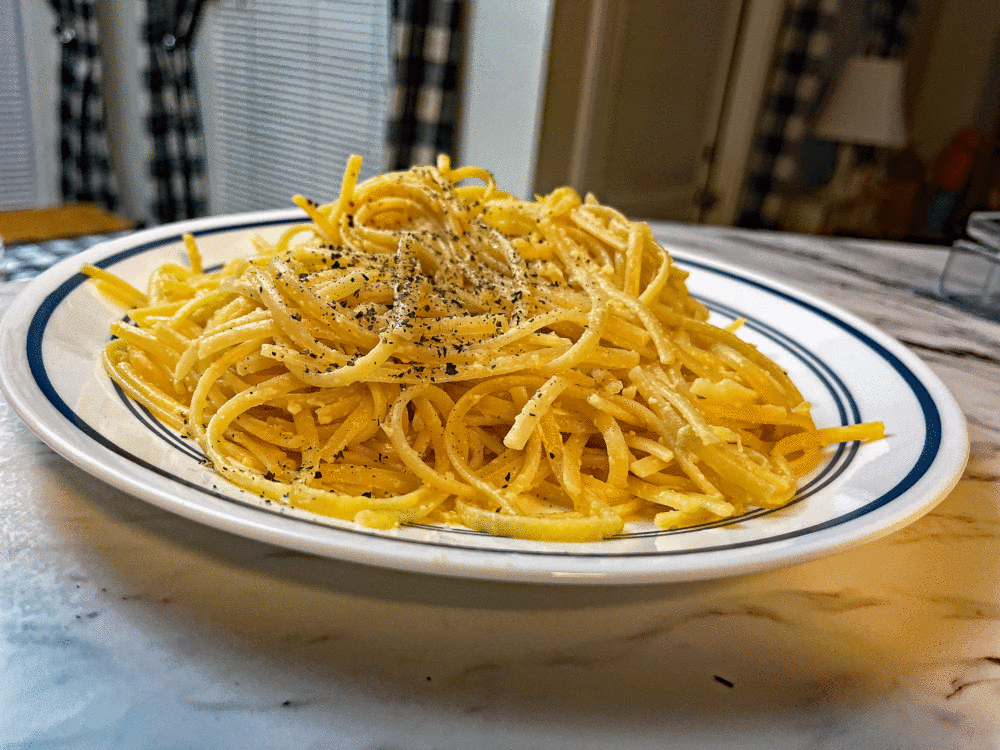 While linguine is cooking, mix egg yolks, cream, zest, juice and Parmesan together lightly with fork.