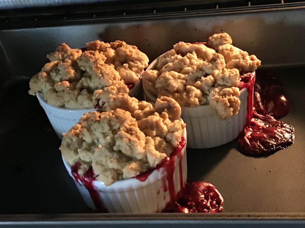Pour into an 8x8" square pan (or into individual ramekins) and top with crumb mixture.